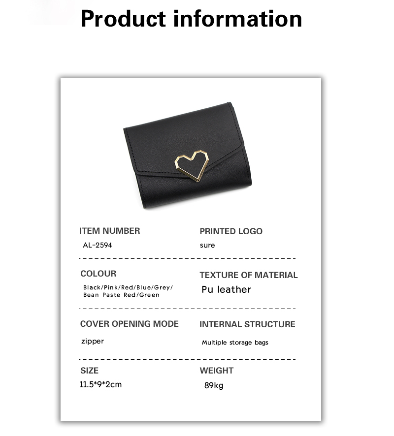 If you are interested in this PU Leather Mini Heart Wallet, please feel free to contact us for samples. ODM & OEM services are supported to meet your brand requirements.